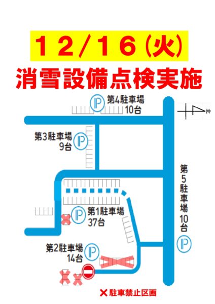 12月16日(火)に消雪設備点検を実施します。それに伴い駐車場の一部が使用できなくなります。ご理解とご協力をよろしくお願いします。
